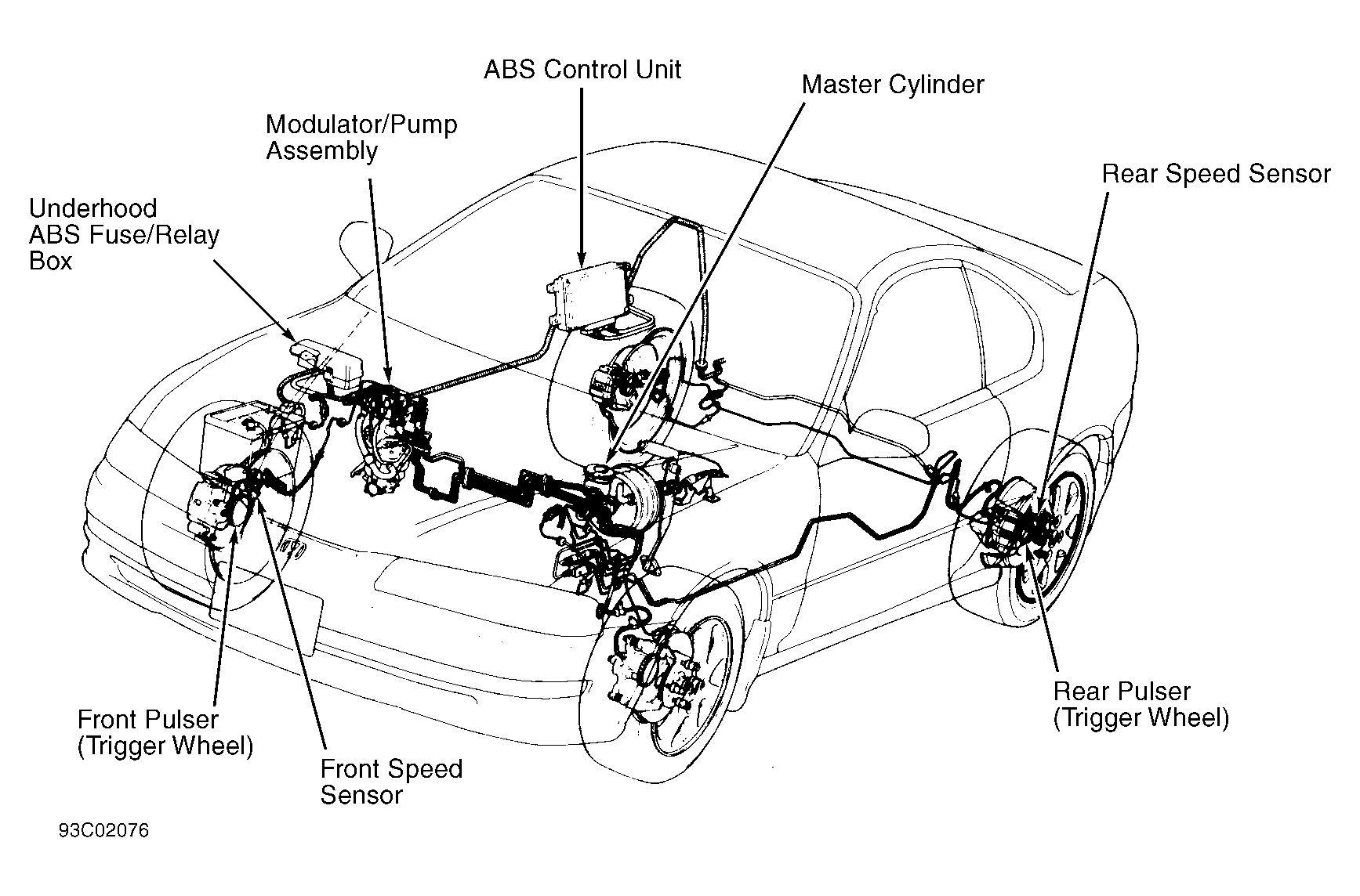 The Anti-Lock Brake System (ABS) is designed to prevent wheel lock-up during hard braking, allowing driver to maintain vehicle control. System consists of control unit, accumulator, ABS pump (power unit), 4 speed sensors, modulator, warning light, master cylinder, power booster assembly and connecting wiring. See Fig 1 .