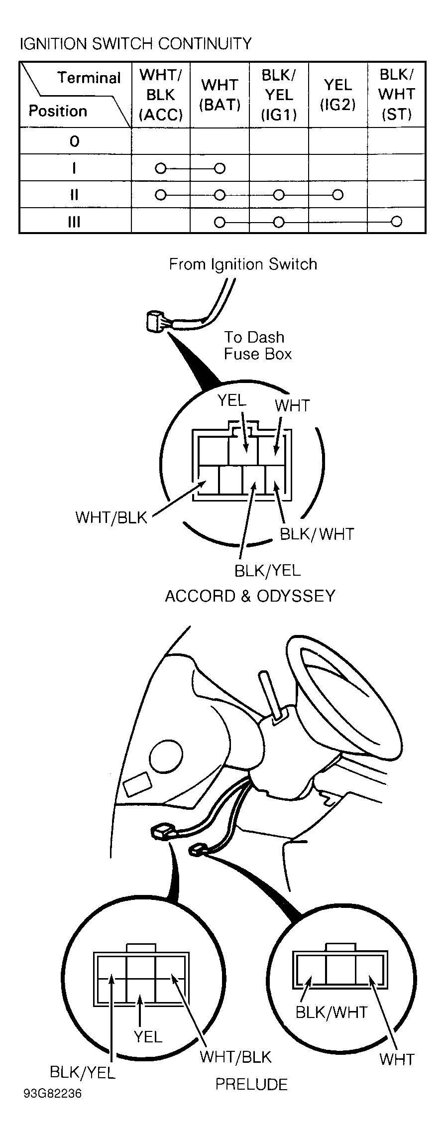 - Disconnect 6-pin connector from dash fuse box and 3-pin connector from main wire harness. See Fig 1 . Use an ohmmeter to check continuity at connector terminals with switch in indicated position. If continuity is not as specified, replace ignition switch.