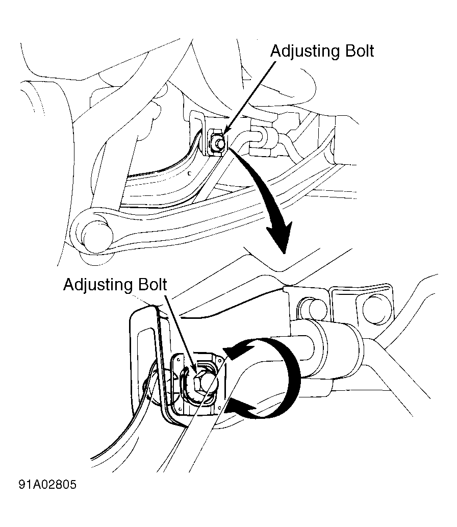 - Check caster and camber. See WHEEL ALIGNMENT SPECIFICATIONS table. Adjust if necessary. Secure steering wheel in straight-ahead position. Ensure parking brake is released. Check rear wheel toe-in. If rear toe-in needs adjustment, hold adjusting bolt on rear lower control arm and loosen lock nut. Adjust rear toe-in by turning adjusting bolt until toe-in is correct. Install NEW lock nut, and tighten it while holding adjusting bolt. See Fig 1 . See TORQUE SPECIFICATIONS .