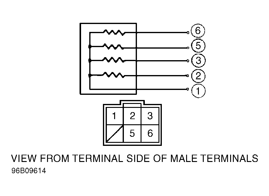 Disconnect injector resistor harness connector. Fuel injector resistor is located in left rear corner of engine compartment. Measure resistance between injector resistor (power) terminal No. 1 (Red wire) and terminals No. 2, No. 3, No. 5 and No. 6. See Fig 1. If resistance is not 5-7 ohms for each measurement, replace injector resistor.