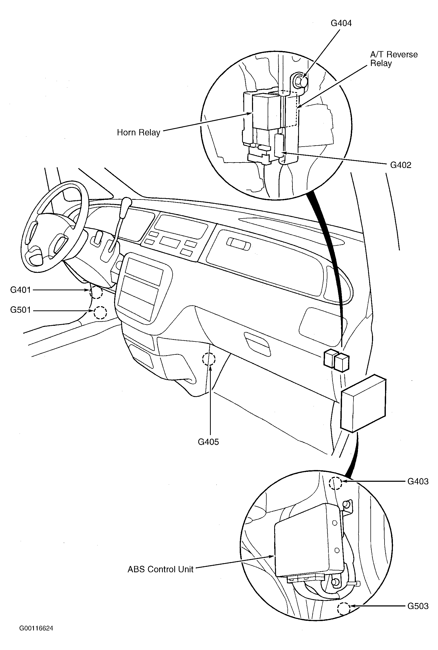 | ABS Control Unit | Behind right kick panel. See Figure . |