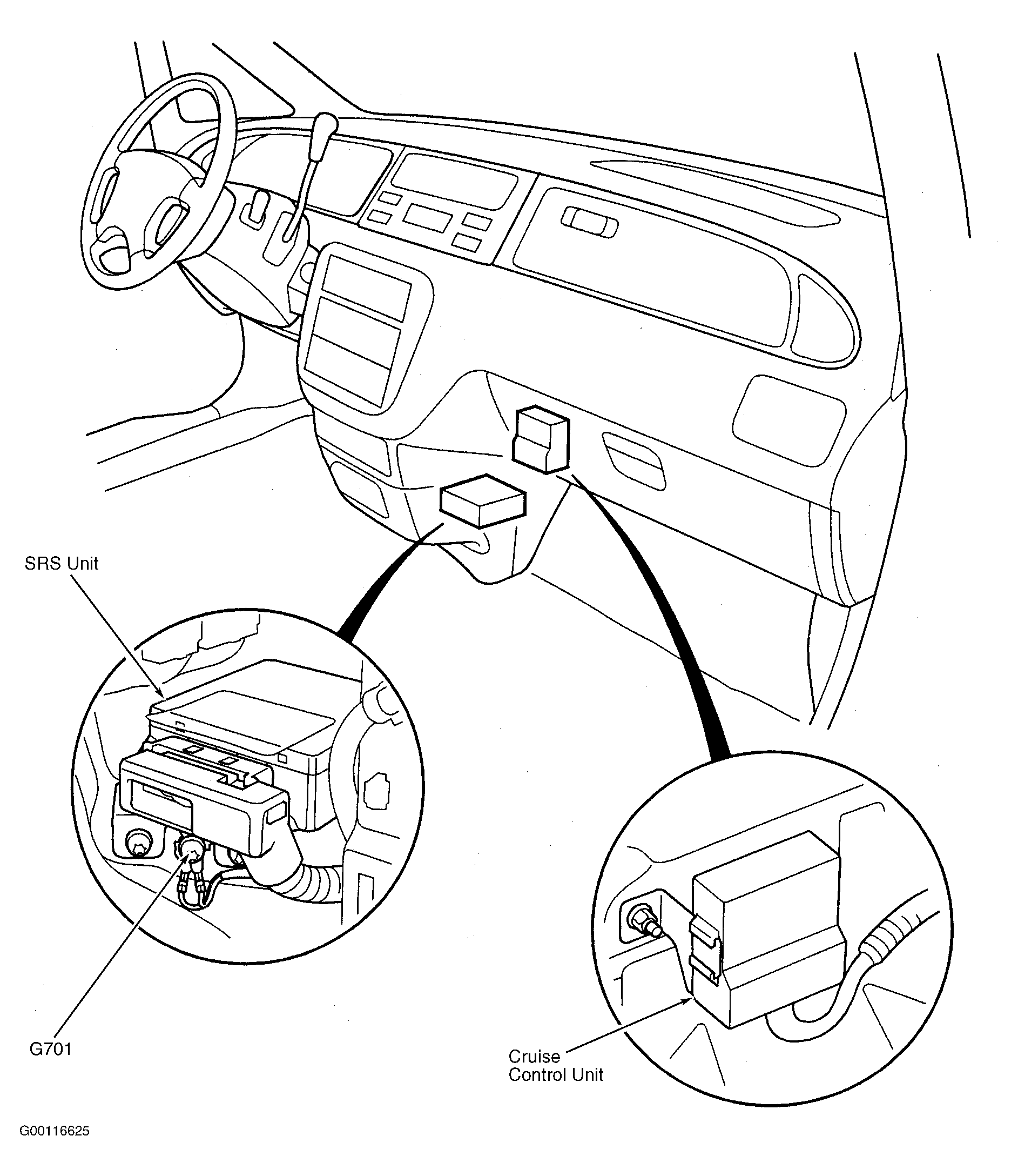 | Cruise Control Unit | Below center of dash, forward of SRS unit. See Figure . |