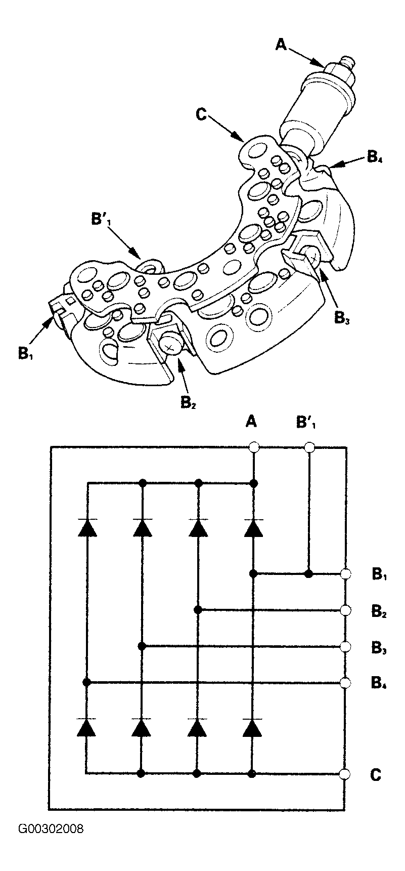 Check for continuity in each direction, between the B terminal "A" and P terminals "B", and between the E terminal "C" and P terminals of each diode pair. See Fig 1 for 2.3L or Fig 2 for 3.0L. All diodes should have continuity in only one direction. Because the rectifier diodes are designed to allow current to pass in only one direction, and the rectifier is made up of 8 diodes (4 pairs) (6 diodes (3 pairs) for 2000-03 models), you must test each diode in both directions for continuity with an ohmmeter that has diode checking capability: a total of 16 checks (12 checks for 2000-03 models). If any diode is faulty, replace the rectifier assembly (Diodes are not available separately). If all the diodes are OK, go to BRUSHES inspection.