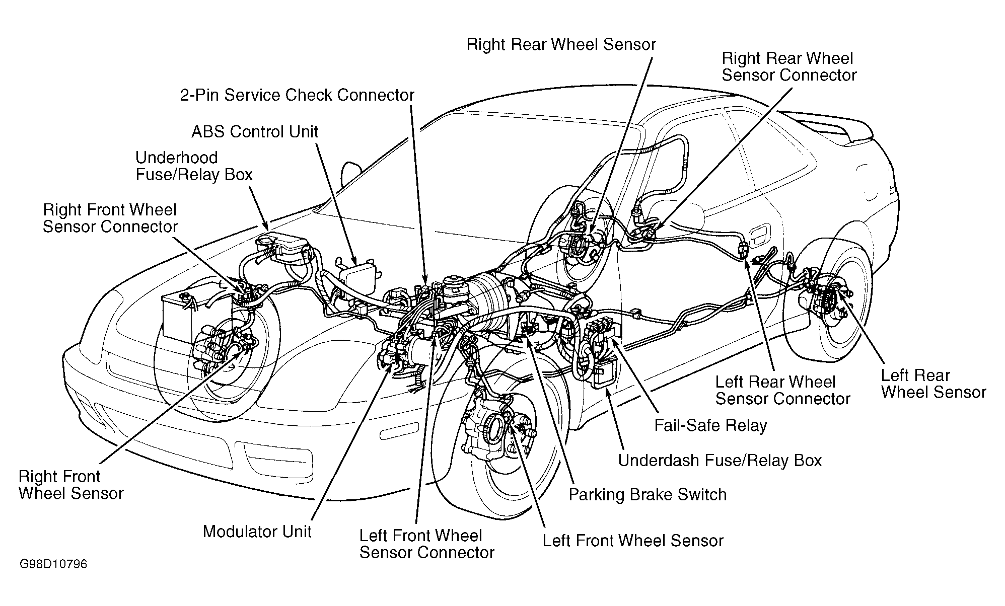 The Anti-Lock Brake System (ABS) is designed to prevent wheel lock-up during hard braking, allowing driver to maintain vehicle control. System consists of ABS control unit, modulator unit, wheel sensors, gear pulsers (trigger wheels), ABS indicator light, master cylinder, power booster assembly and connecting wiring. See Fig 1 . ABS hydraulic circuit is a 4-channel brake system that individually controls front and rear wheels.
