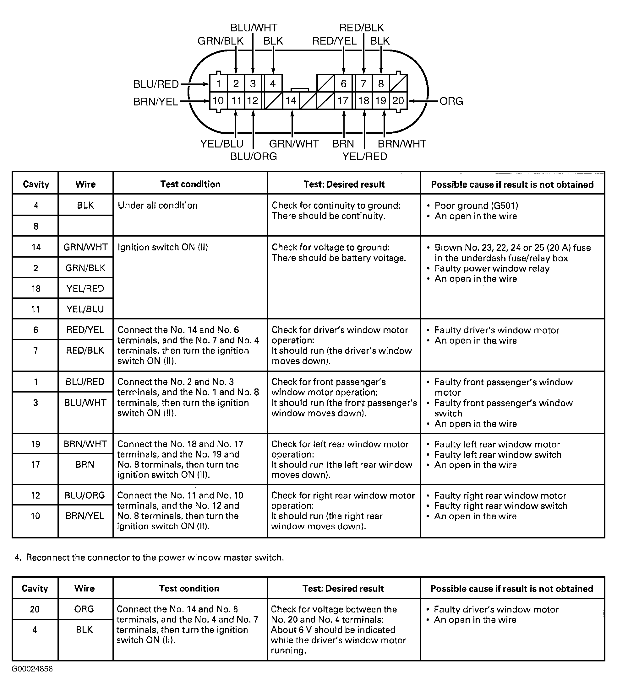 Turn ignition off. Remove driver's door panel. See DOOR PANEL under REMOVAL & INSTALLATION. Unplug connectors from master switch. Using a DVOM, perform appropriate switch input tests. See Fig 1 and Fig 2 . If all input test results are okay, inspect connector and terminals for damage and proper fit. If connector is okay and power windows still malfunction, replace master switch.