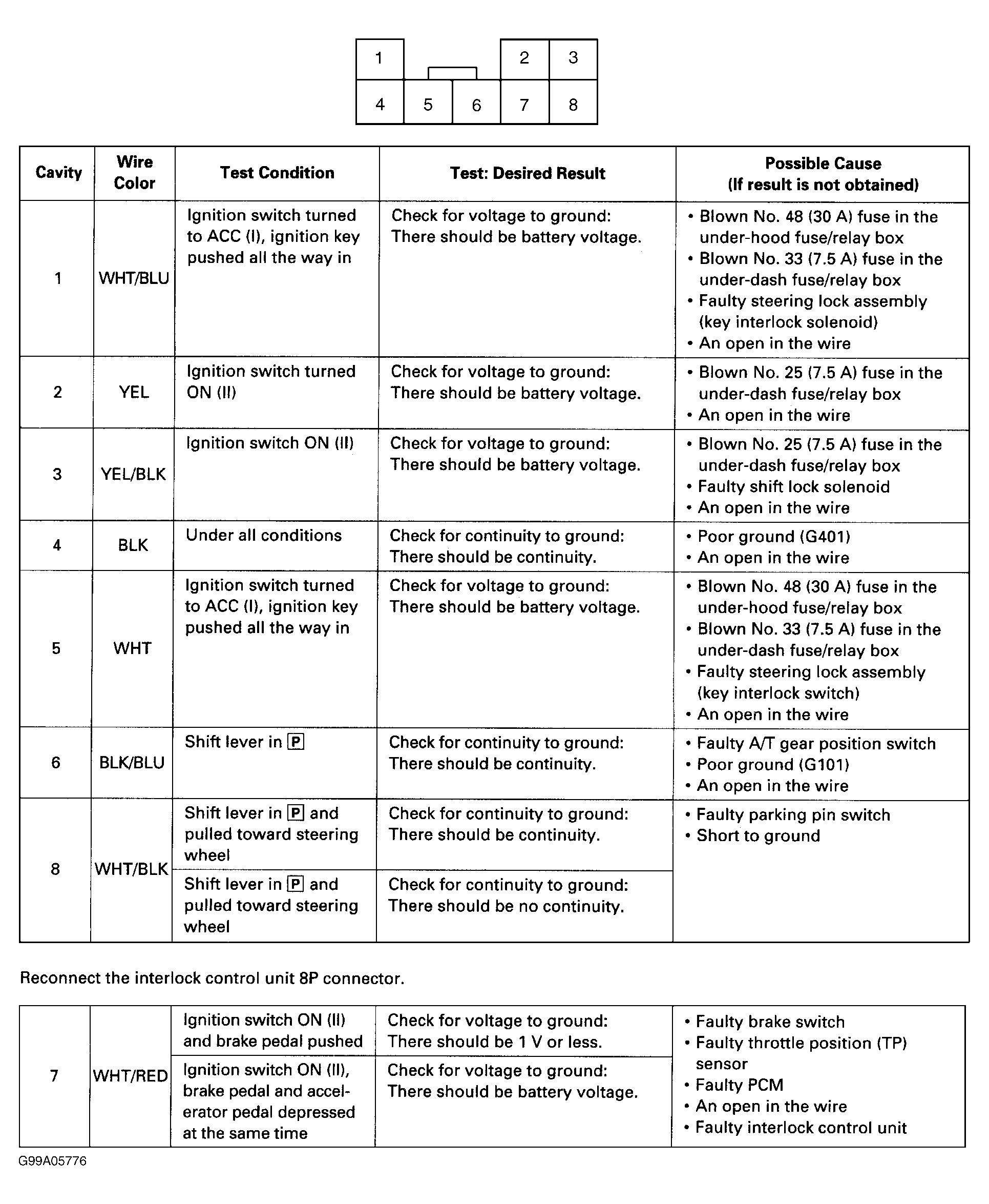 - Check for continuity between interlock control unit harness connector terminal No. 8 (White/Black wire) and ground. If continuity does not exist, go to next step. If continuity exists, repair short in White/Black wire between interlock control unit and parking pin switch.