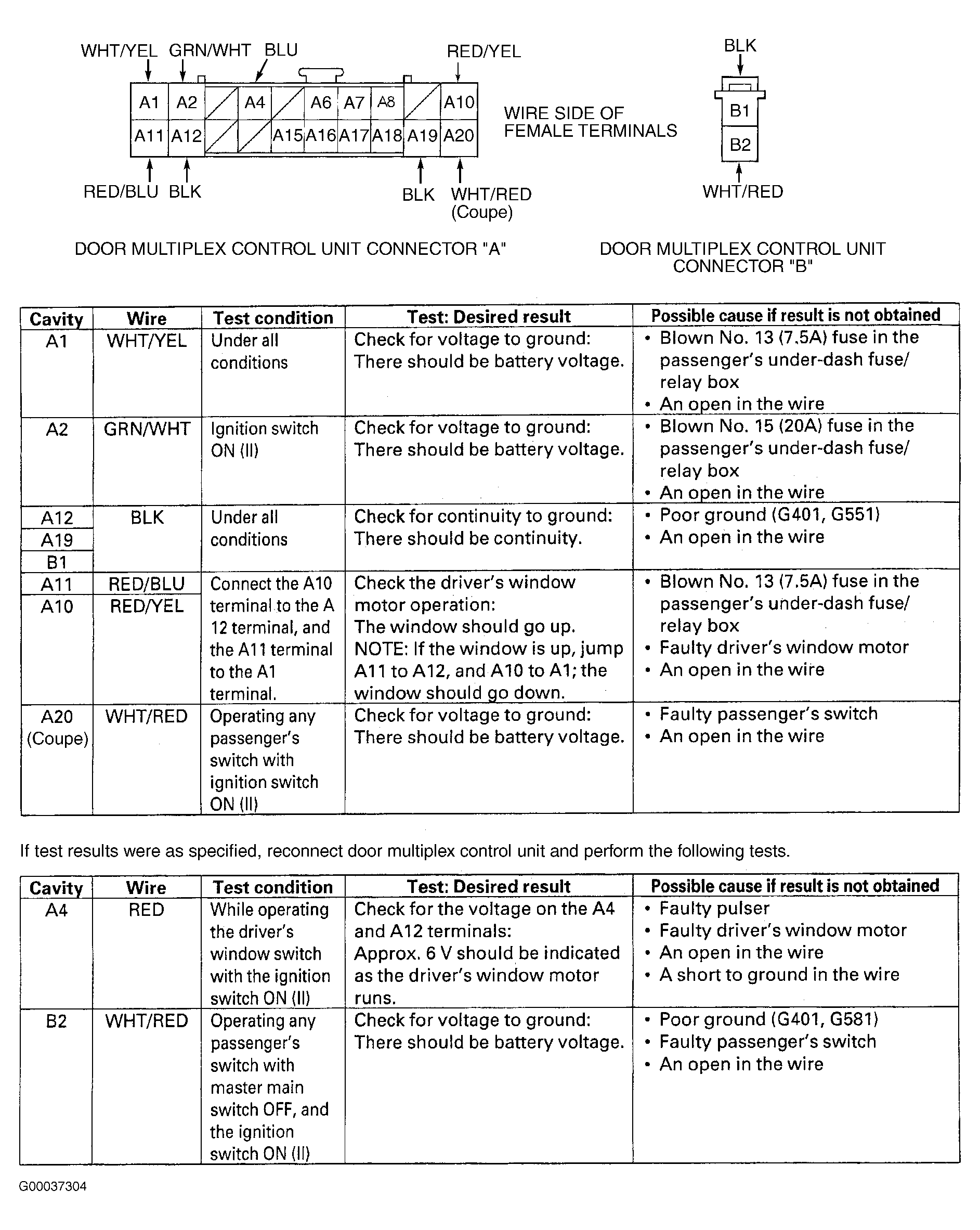 Remove master power window switch from driver's door. See MASTER POWER WINDOW SWITCH  under REMOVAL & INSTALLATION. Disconnect 20-pin harness connector. Inspect connector terminals for damage or corrosion. Repair or replace as necessary, then retest system. If connections are okay, using a DVOM, perform driver's control unit input test. See Fig 1 or Fig 2 . On Prelude, if all input tests are okay, replace door multiplex control unit.