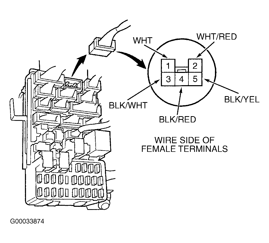 Disconnect negative battery cable. Remove driver's side lower instrument panel cover and knee bolster. Disconnect 5-pin connector from underdash fuse/relay box. Using an ohmmeter, check continuity between specified connector terminals, with ignition switch in appropriate position. See Fig 1 and Fig 2 . If continuity is not as specified, replace ignition switch.