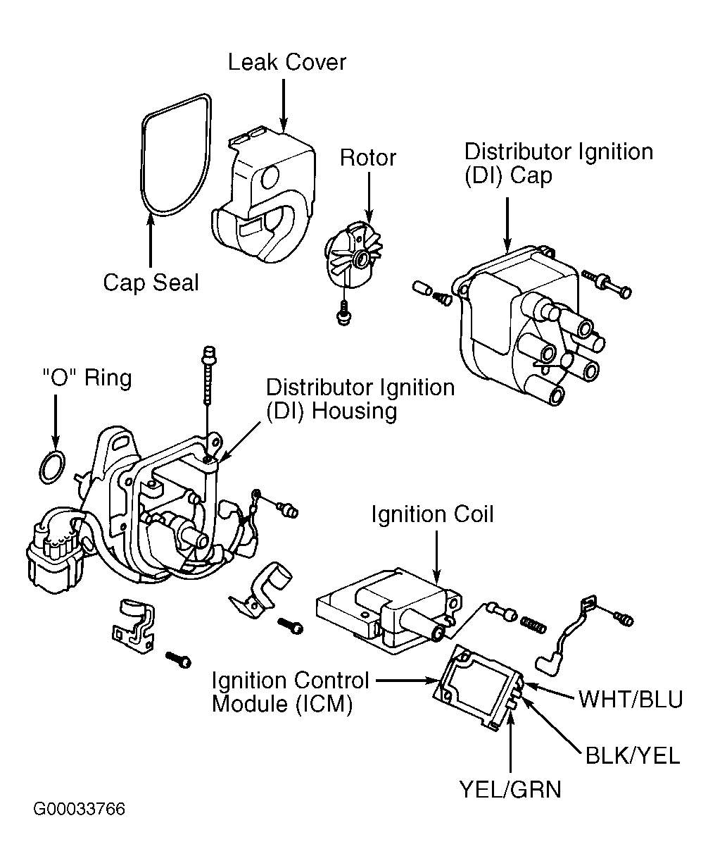 - Turn ignition off. Remove distributor cap, rotor, leak cover and cap seal. Disconnect wires from ICM. See Figure. Turn ignition on. Check for voltage between body ground and Black/Yellow wire. If battery voltage exists, go to next step. If battery voltage does not exist, check for open in Black/Yellow wire between ignition switch and ICM. See WIRING DIAGRAMS article.