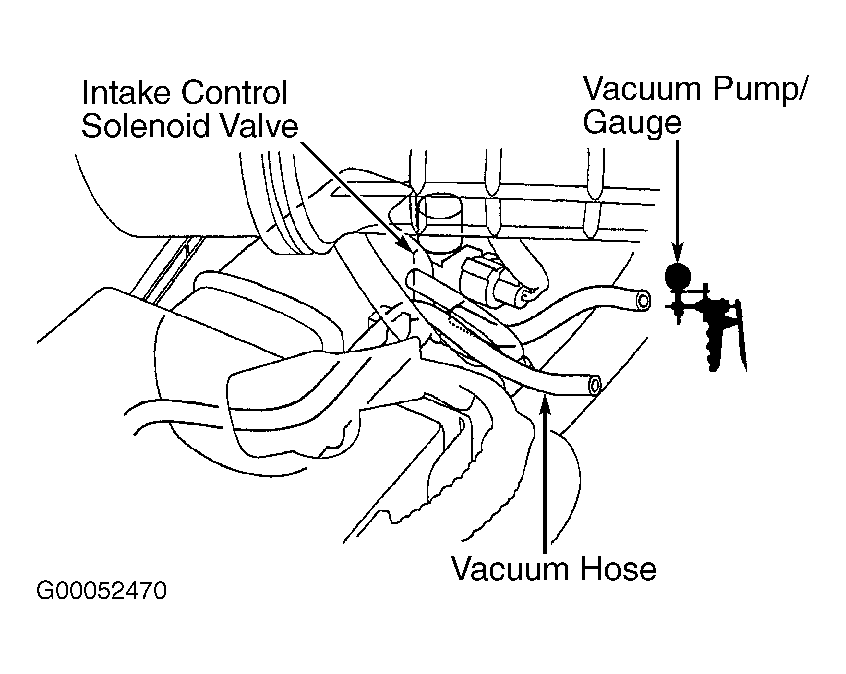 1. Start engine and allow to idle. Disconnect vacuum hose from upper port of intake control solenoid valve located at right side of engine, under intake duct. Connect vacuum pump/gauge to intake control solenoid valve. See Fig 1. Check for vacuum at intake control solenoid valve. If vacuum does not exist, go to next step. If vacuum exists, go to step  6.