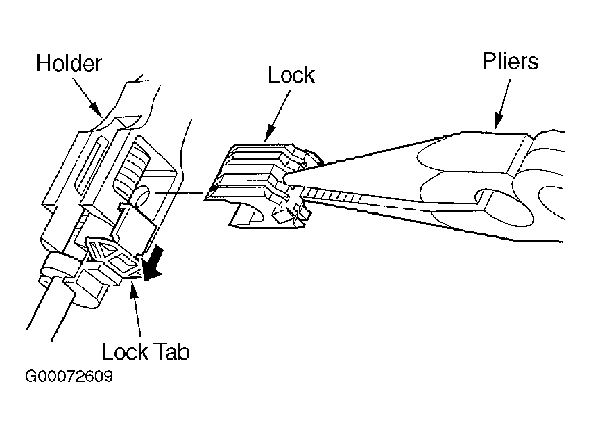 - Grasp the shift cable lock in the middle with needle-nose pliers, and remove it from the shift cable end and shift cable end holder. See Figure.