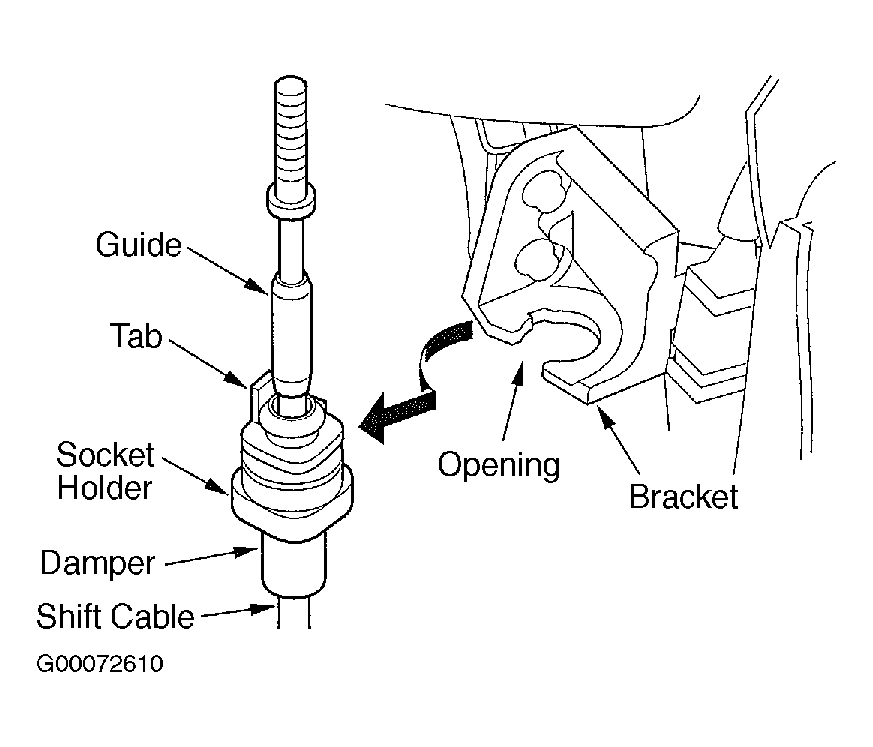 - Rotate the socket holder on the shift cable a quarter turn, the tab on the socket holder will be in the opening of the socket holder bracket. Then slide the holder to remove the shift cable from the socket holder bracket. See Figure.