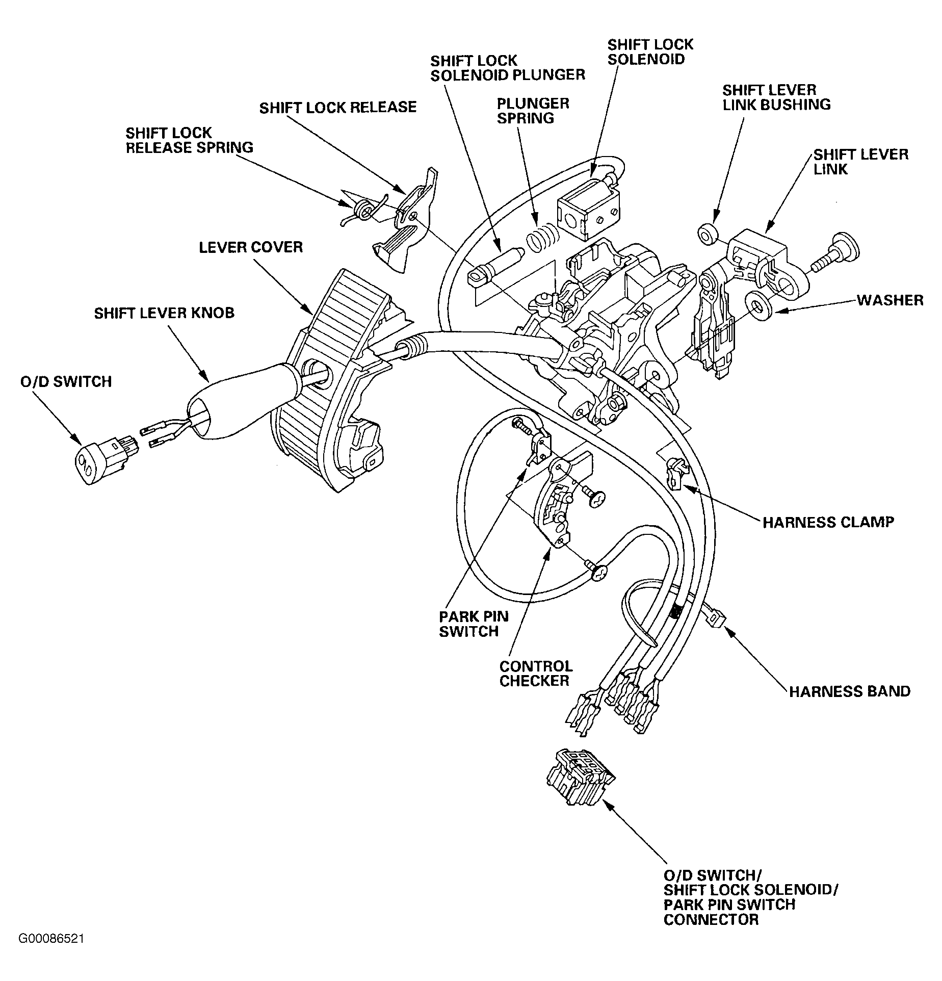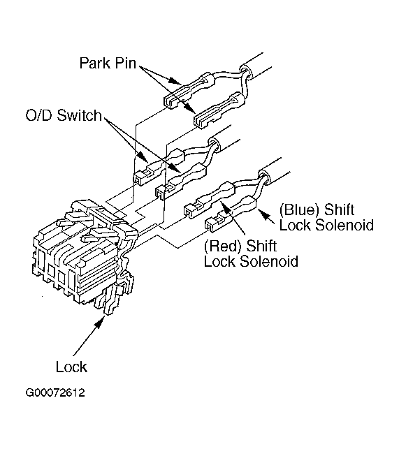 - Disconnect the O/D switch/shift lock solenoid/park pin switch connector. See Figure.