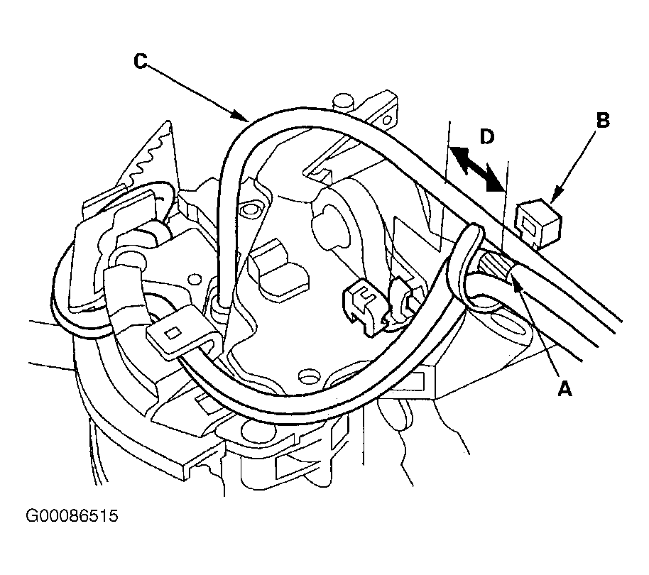 - Align the marks (A) on the harnesses, and tie the harness band (B) over the marks. Clamp the O/D switch harness (C) .6" (15 mm) (D) from the harness band. See Figure.