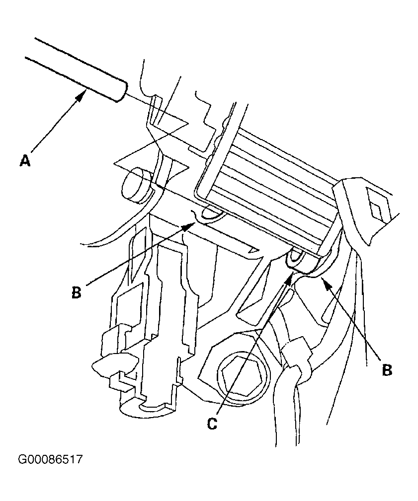- Insert a .24" (6.0 mm) pin (A) into the positioning holes (B) on the shift lever bracket base and through the positioning hole (C) on the shift lever. See Figure. The shift lever is secured in the "R" position.