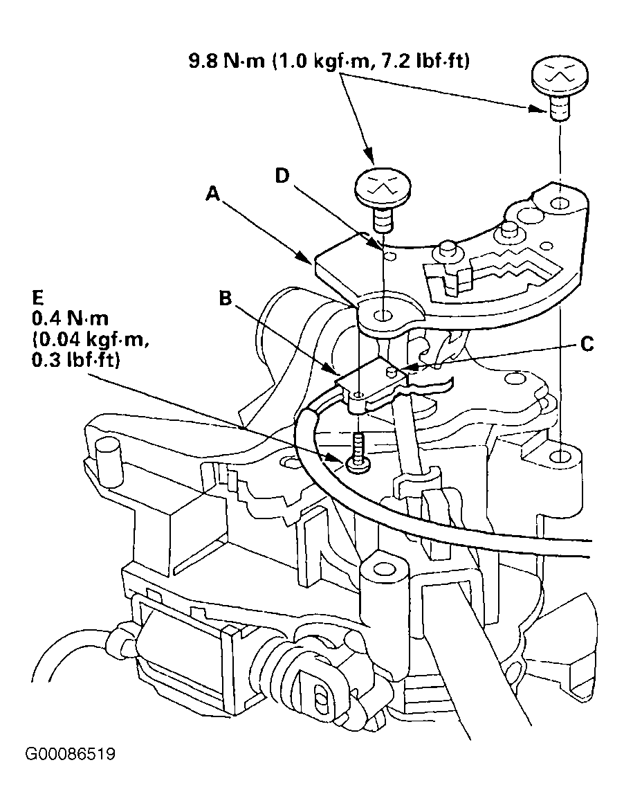 - Install the new park pin switch (B) by aligning its tab (C) with the positioning hole (D) on the control checker. Apply non-hardening thread lock sealant to the screw (E), then secure the park pin switch with the screw.
