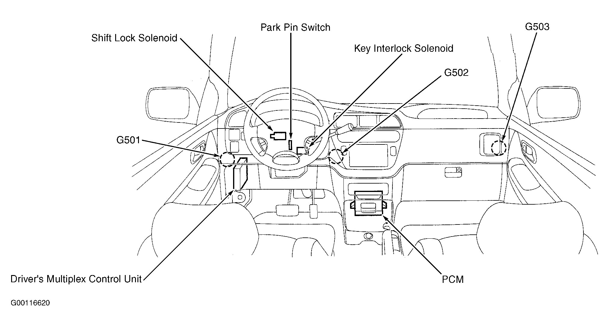 | Passenger Multiplex Control Unit | In passenger underdash fuse/relay box. |