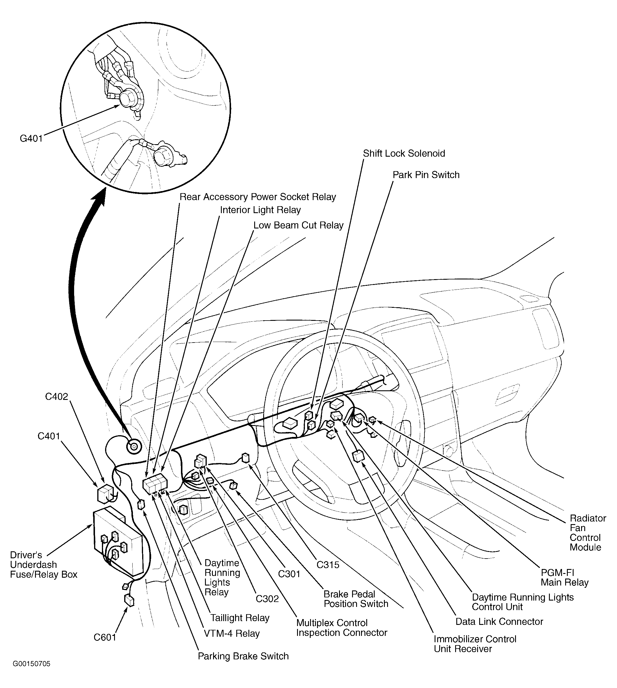 | Daytime Running Lights Control Unit | Behind left side of dash. See Figure. |