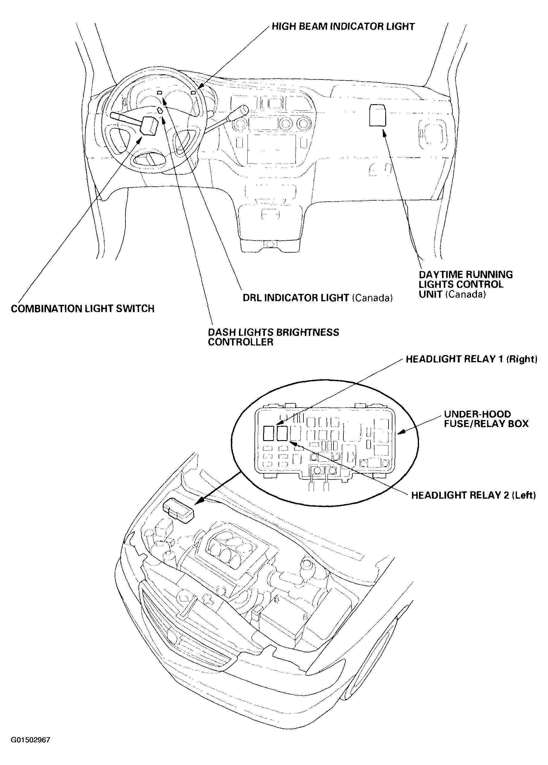 | Daytime Running Lights (DRL) Control Unitt | Behind glove box. See Figure. |