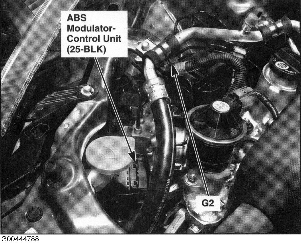ABS Modulator-Control Unit Right side of engine compartment. See Figure.