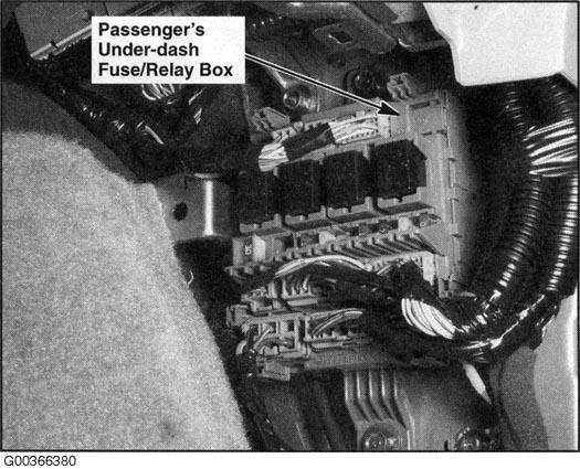 | Passenger's Under-Dash Fuse/Relay Box | Under right side of dash. See Figure. |