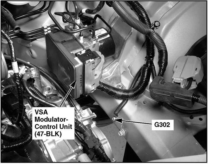 | VSA Modulator Control Unit | Left rear of engine compartment. See Figure. |