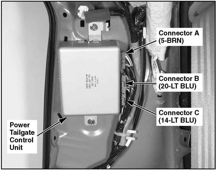 | Power Tailgate Control Unit | In left "D" pillar. See Figure. |