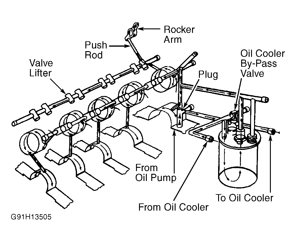 Pressurized lubrication is provided by gear-type oil pump. See Fig 1. Camshaft drives oil pump through shaft of a gear-driven engine speed sensor. Lubrication flows through external oil cooler then into full-flow oil filter. Nonadjustable oil pressure regulator valve is located in oil pump body. Main oil gallery supplies oil through drilled passages to camshaft and crankshaft bearings. Oil flows through galleries to valve lifters then through hollow push rods to rocker arms.