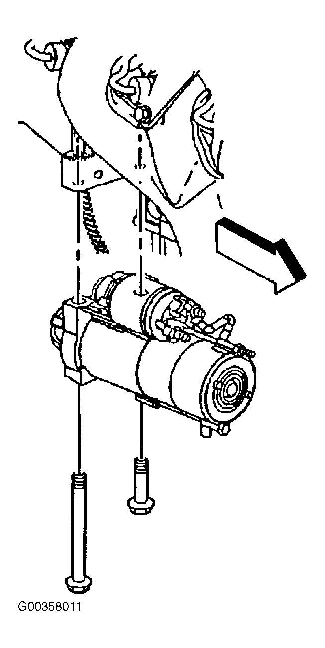 . Install the starter motor bolts. Tighten the starter motor bolts to specifications. See TORQUE SPECIFICATIONS