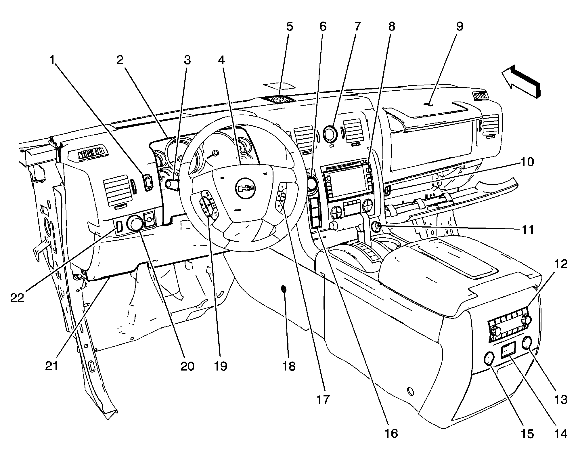 | Inflatable Restraint I/P Module (9) | Right side of dash, directly in front of passenger seat. See Figure. |