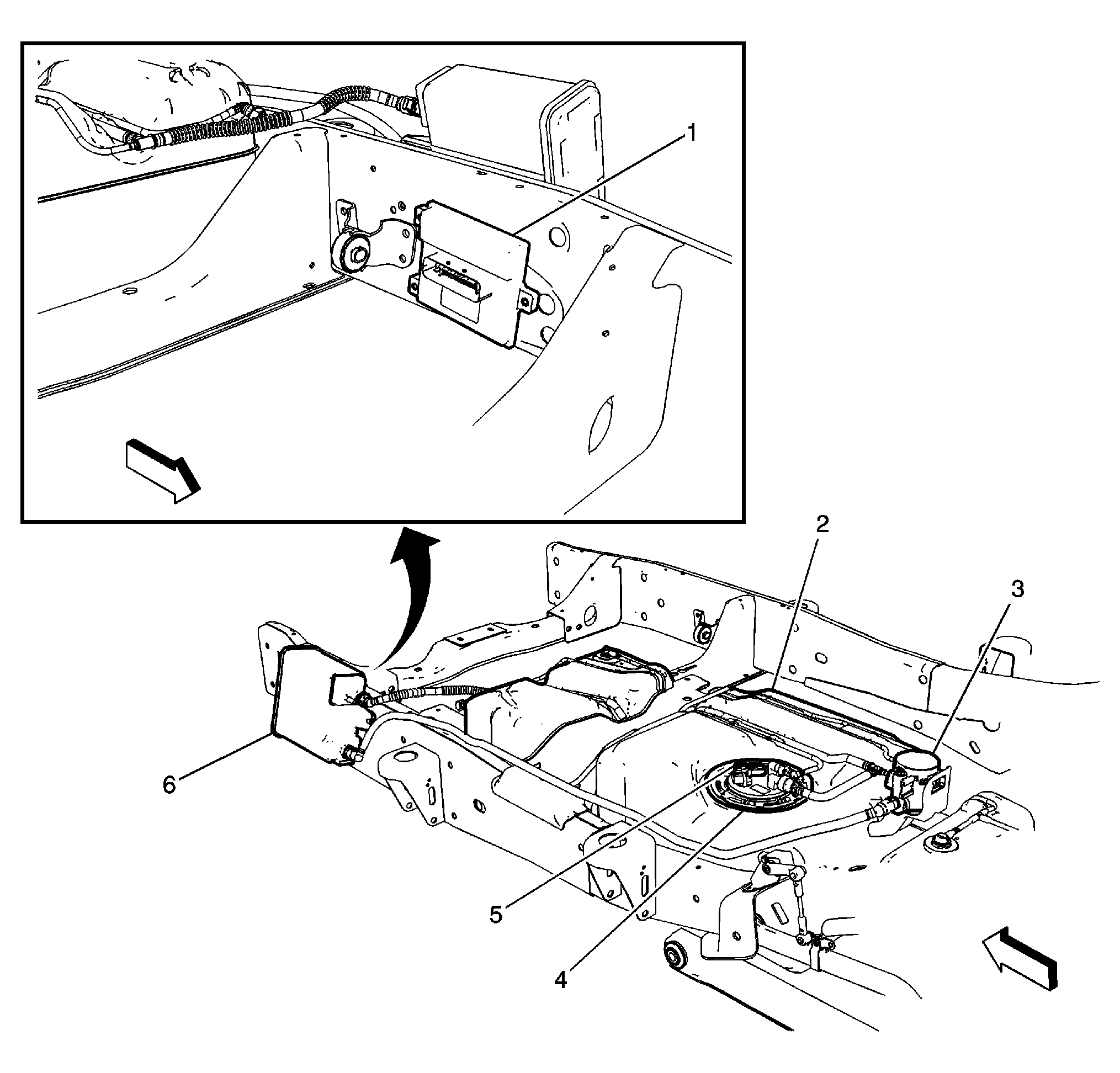 | Fuel Pump Flow Control Module (1) | Mounted to rear frame, near EVAP canister vent solenoid valve. See Figure. |