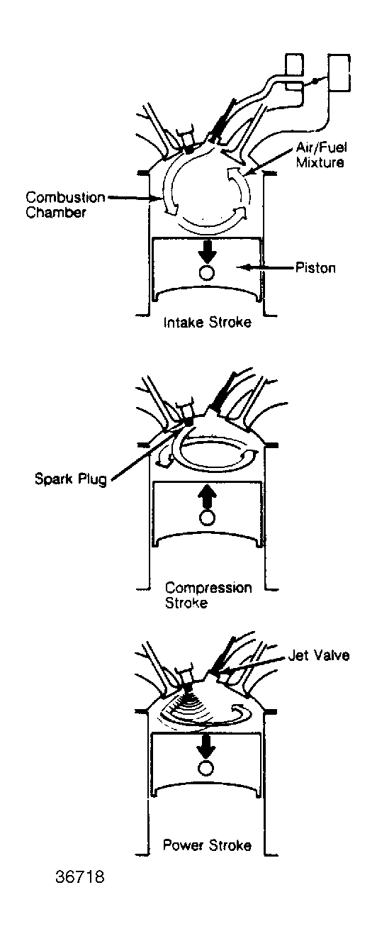 Jet and intake valve open and closes almost simultaneously. On intake stroke air/fuel mixture flows through intake valve port into combustion chamber.