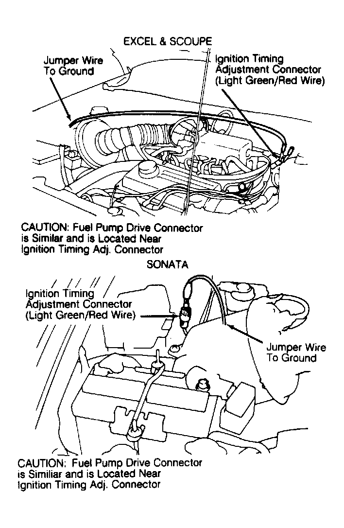 - Ensure vehicle is at normal operating temperature, all accessories are off and transmission is in Park or Neutral. Vehicle front wheels must be in straight-ahead position and curb idle speed set to specification. For Excel models, go to next step. For Sonata models, go to step 3).