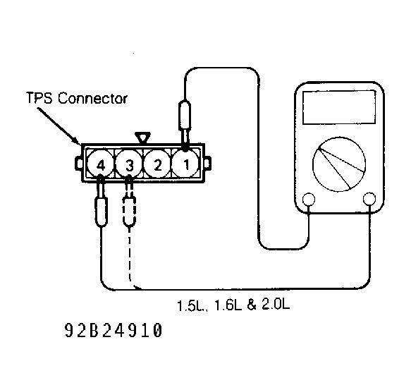 - On 1.5L, 1.6L and 2.0L, use an analog ohmmeter to measure resistance between terminals No. 1 (Black wire) and No. 3 (Light Green/Yellow wire on 1.5L and 1.6L; Green/White on 2.0L). On 3.0L, measure resistance between terminals No. 2 (Black wire) and No. 4 (Green/Red wire). Slowly operate throttle valve from closed to wide open throttle.