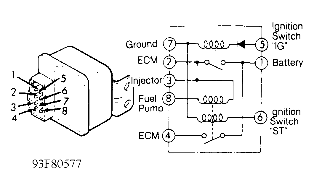 - Remove control relay, located behind glove box. Using an ohmmeter, check resistance between terminals No. 3 and 8 and then terminals No. 2 and 8. See Fig 1
