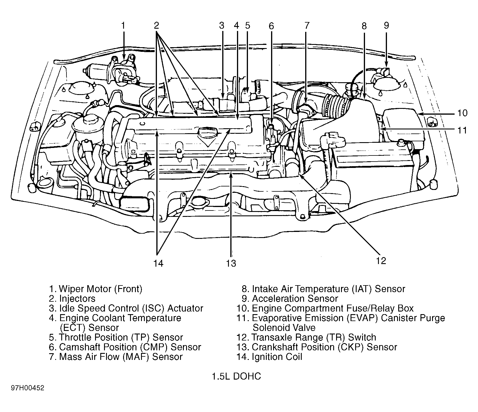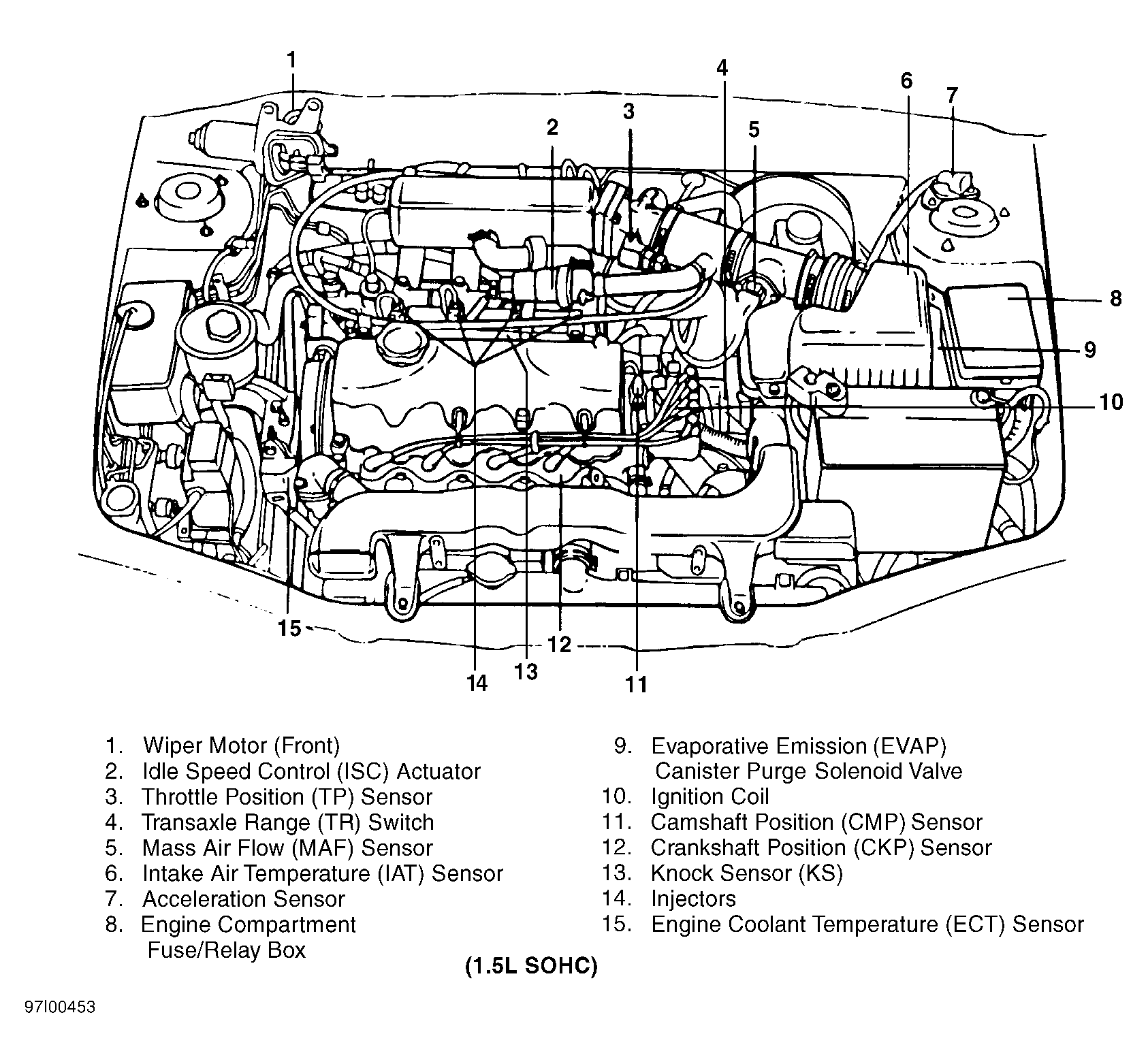 | Engine Compartment Fuse/Relay Box (1.5L SOHC) | On left side of engine compartment, in front of shock tower. See Figure . |