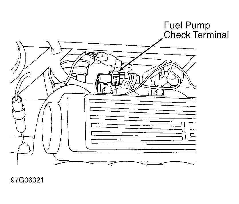 Turn ignition off. Apply battery voltage to fuel pump check terminal connector. See FUEL PUMP CHECK TERMINAL WIRE IDENTIFICATION table. See Fig 1 . Remove fuel tank cap and listen for fuel pump operation. Pinch fuel hoses by hand and ensure fuel pressure can be felt.