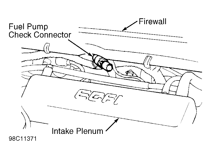 Turn ignition off. Apply battery voltage to fuel pump check terminal connector. See FUEL PUMP CHECK TERMINAL WIRE IDENTIFICATION table. See Fig 1, Fig 2 or Fig 3 . Remove fuel tank cap and listen for fuel pump operation. Pinch fuel hoses by hand and ensure fuel pressure can be felt.
