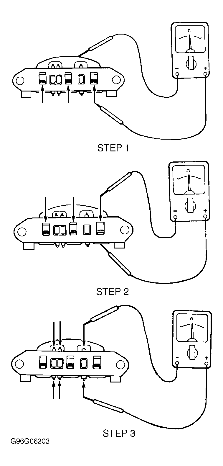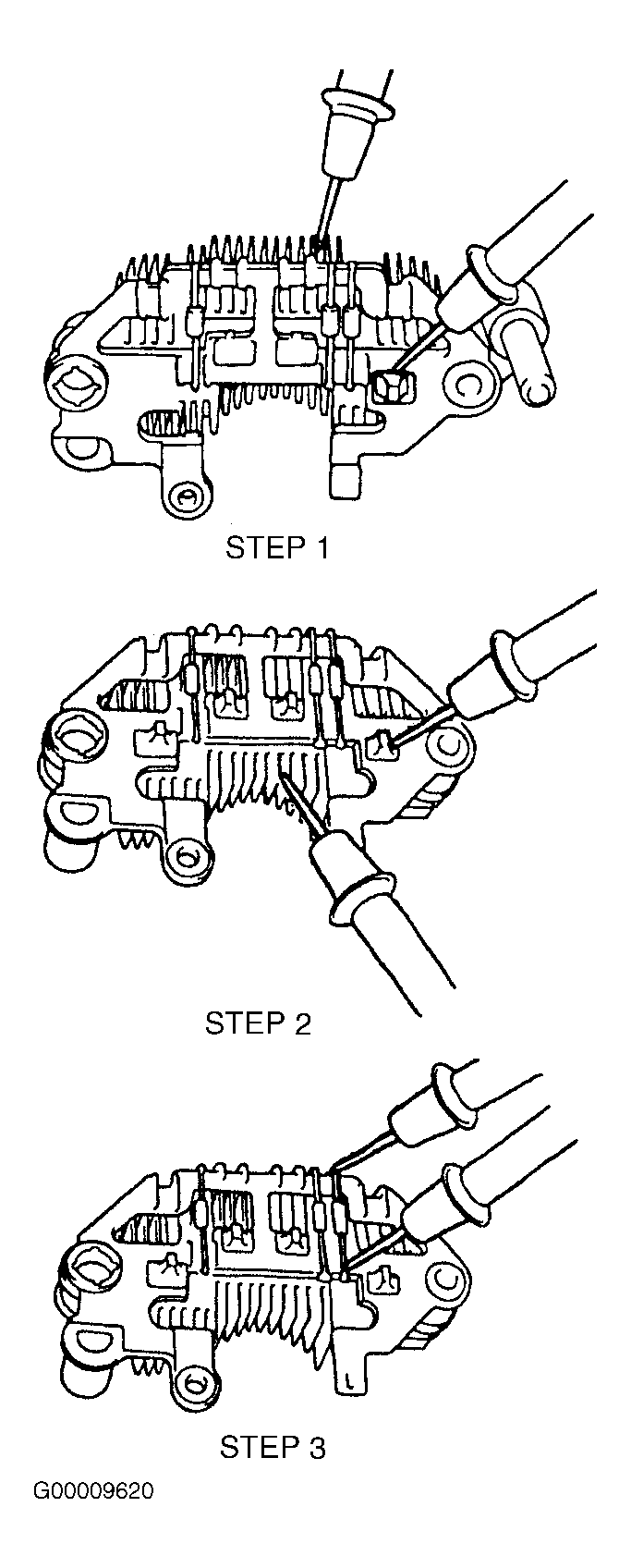 Using ohmmeter, check continuity of each diode, in both directions. See STEP 3 in illustration. See Fig 1-Fig 3 . Continuity should exist in only one direction. If continuity of any diode is not as specified, replace rectifier assembly.