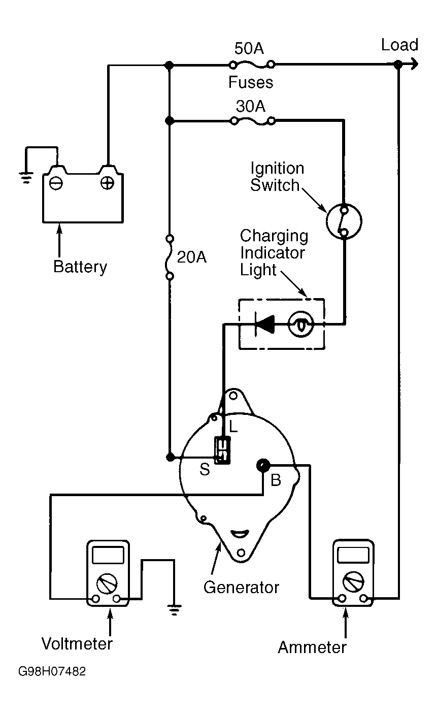 - If voltmeter indicates battery voltage, go to next step. If voltmeter indicates zero volts, check for open wire between positive battery terminal and generator terminal "B", blown fusible link, or poor ground.
