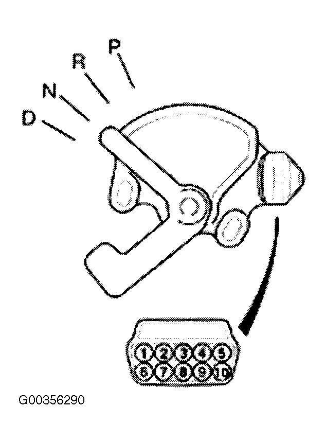 1. Disconnect transaxle range switch harness connector located on top of transaxle. Ensure continuity exists between switch terminals No. 9 and 10 when shift selector lever is in Park and Neutral. See Fig 1 .