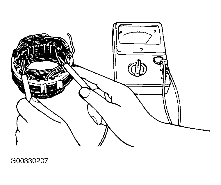 2. Check continuity between each stator coil lead and stator core. See Fig 2 . There should be no continuity between any stator coil lead and stator core. If continuity exists, replace stator assembly.