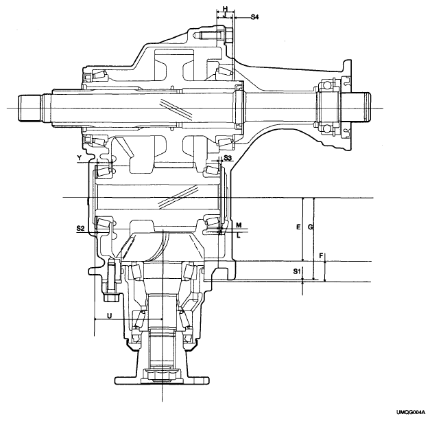 The tooth contact patterncan be moved to the arrow direction by installing the spacer S2(47384-39000) using a thinner one and gradually install a thickerone - Remove the pinion assembly. With the spacer S3 and transfer cover mounted, combined preload torque for the hypoid gear shaft assembly and transfer gear (measured on transfer gear) should be 2.7 to 3.8 Nm. The spacer S3 has to be changed, if the preload torque is not within the permissible range.