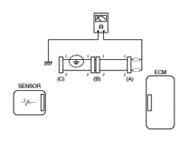 - With each connector still connected, measure the voltage between the chassis ground and terminal 1 of each connectors (A), (B) and (C) as shown in [Fig 4].