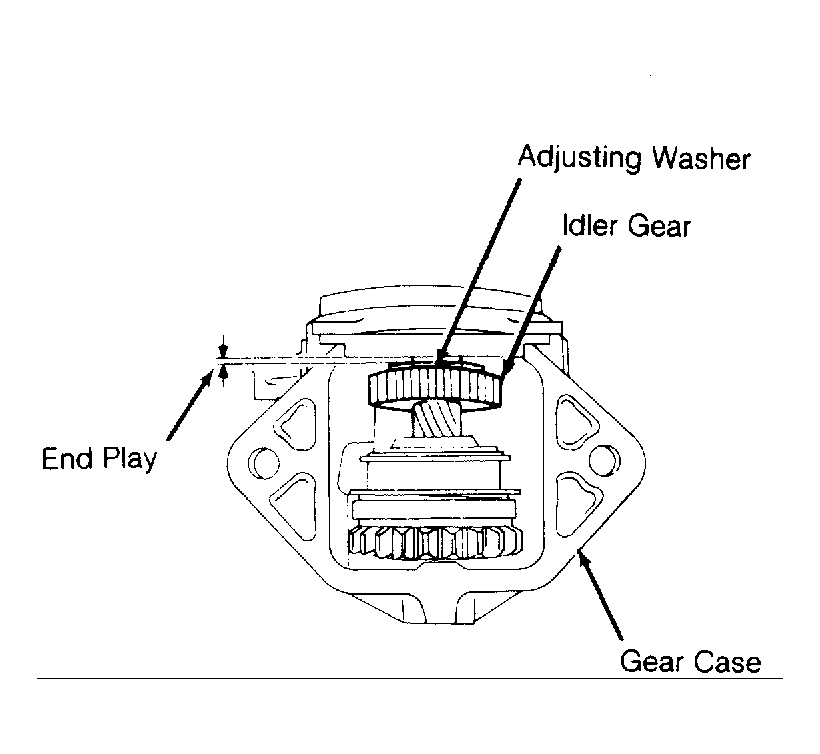 - Turn idler gear by hand in axial direction and check end play between idler gear and rear of gear case. See Fig 4. End play should be between .004-.020" (.1-.5 mm). Adjust by installing adjusting washer between idler gear and center bracket. The Q45 model has no clearance requirement.