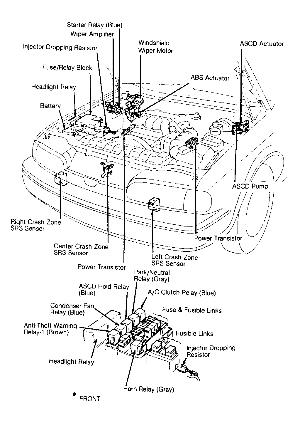 | Fuse/Relay Block | In right front of engine compartment, near battery. See Figure . | |