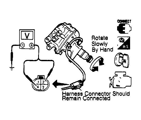 2. Connect negative voltmeter lead to ground. Rotate crank angle sensor shaft slowly by hand. Connect positive voltmeter lead to crank angle sensor connector terminal No. 3 (120-degree signal), voltage should fluctuate between 0-5 volts. Move voltmeter positive lead to terminal No. 4 (1-degree signal), voltage should also fluctuate between 0-5 volts. See Fig 1 .