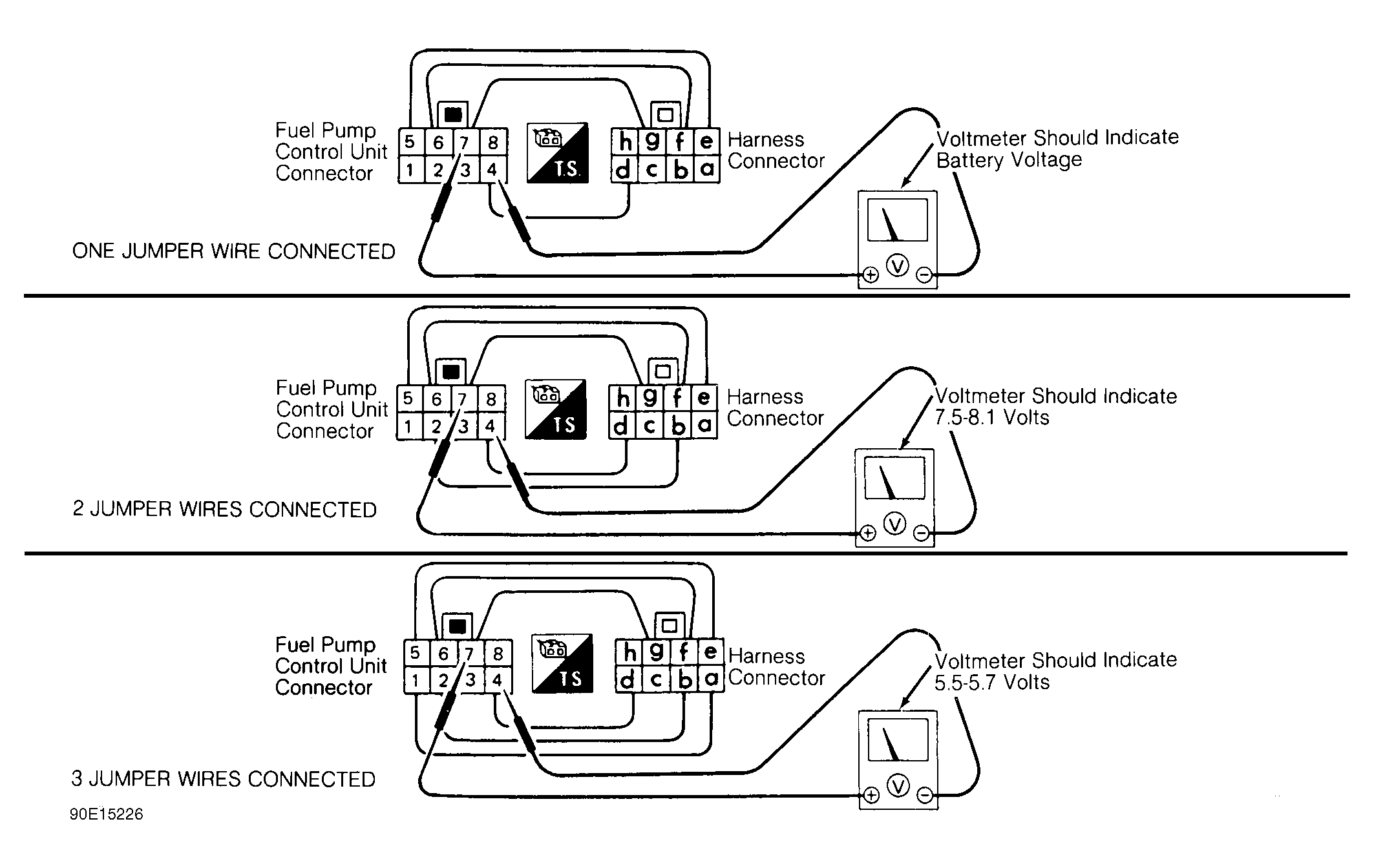 2. Connect first one, then 2, and finally 3 jumper wires as indicated in illustration. Using a DVOM, check voltage at fuel pump control unit connector as each jumper wire is connected. See Fig 1 . If voltage readings are not as indicated, replace fuel pump control unit.