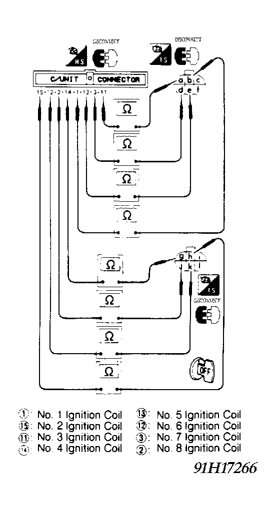 2. Check harness continuity between ECU and ignition coil in each cylinder. See Fig 1 . Continuity should be present. If continuity is not present, repair or replace harness or connectors.