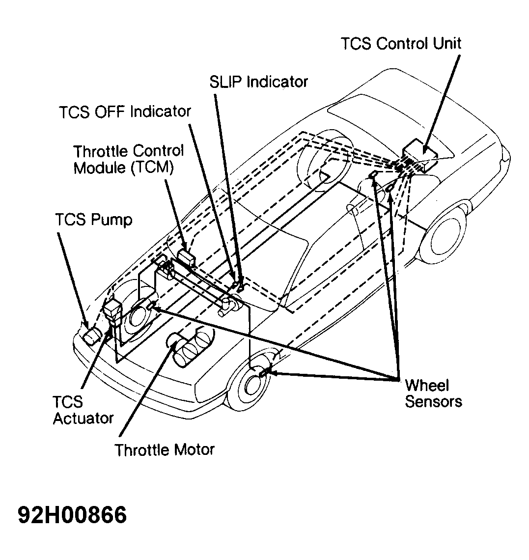 The Infiniti Traction Control System (TCS) uses engine throttle control and individual control of the left and right rear brakes to prevent driving wheel spin during acceleration or cornering. The TCS system consists of wheel sensors, TCS Control Unit, Throttle Control Module (TCM), throttle motor, TCS actuator, SLIP indicator and TCS OFF indicator. See Fig 1 and Fig 2 .